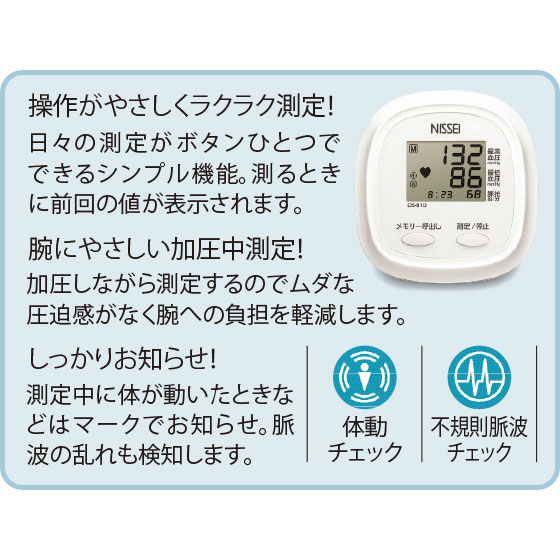 日々の測定がボタンひとつでできるシンプル機能。測るときに前回の値が表示されます。加圧しながら測定するのでムダな圧迫感がなく腕への負担を軽減します。測定中に体が動いたときなどはマークでお知らせ。脈波の乱れも検知します。