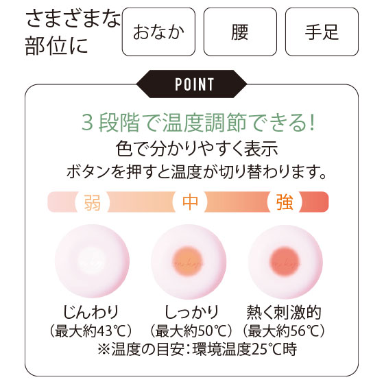 3段階で温度調節できる!色で分かりやすく表示。ボタンを押すと温度が切り替わります。