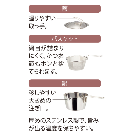 メッシュ仕様のバスケットに入れて引き上げるだけ。布でこしたような美味しいだしが簡単にとれます。えだまめなど野菜の茹で上げにも便利。