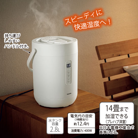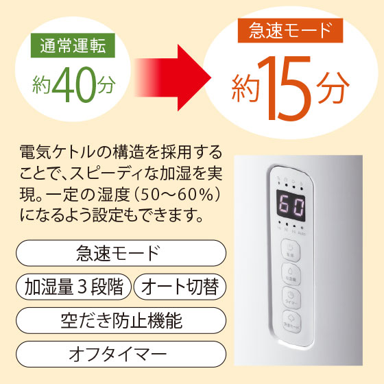 水を加熱して加湿するスチーム式。急速モードを搭載し、最速約15分で加湿可能に。※急速モード終了後は、通常運転に戻ります。