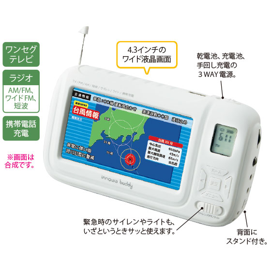 非常時こそ、正確な情報が大切。充電池、乾電池に加え手回しで充電ができ、ワンセグテレビやラジオの使用はもちろん、いざというときのスマホ充電も可能です。