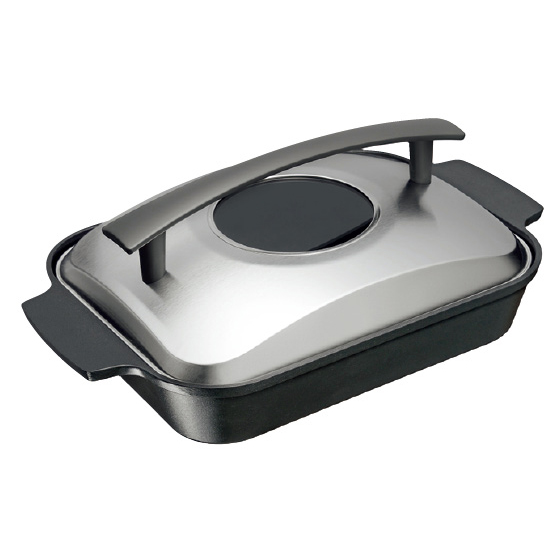 ●材質:本体=アルミニウム合金(内面/フッ素樹脂塗装(炭配合)、底/鉄溶射加工)、蓋=ステンレス鋼・全面物理強化ガラス、ハンドル=ナイロン(ガラス繊維入り)、水差し=ポリプロピレン