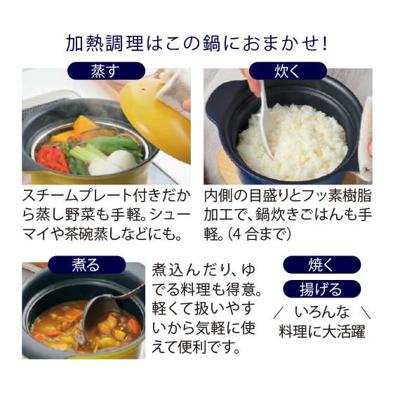 スチームプレート付きだから蒸し野菜も手軽。シューマイや茶碗蒸しなどにも。煮込んだり、ゆでる料理も得意。軽くて扱いやすいから気軽に使えて便利です。