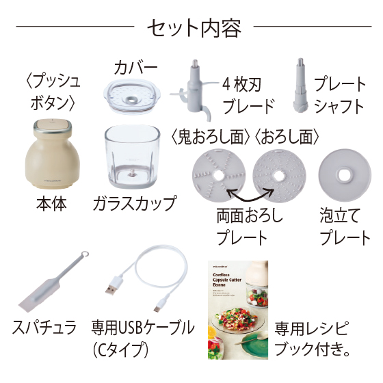 みじん切りから鬼おろしまで、面倒な作業はおまかせ。材料を入れてボタンを押すだけの簡単2ステップ。いろいろな下ごしらえはもちろん、ジェラートやスムージーなどのデザートづくりも大得意です。コードレスだから使う場所も選ばない!