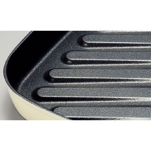 斜めに走る波型プレートで、余分な脂が落ち、きれいな焼き目もつけられます。表面はこびりつきにくく、洗いやすいフッ素樹脂塗膜加工。