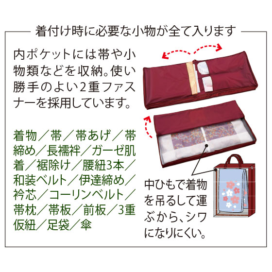 着物を吊り下げた状態で収納し、シワや型崩れを防ぎながら持ち運べる安心設計です。天板入りでバッグがつぶれにくく、小物収納に便利なポケット類も豊富。着物を愛用する人の気持ちに寄り添い、隅々まで思いやりが施されています。