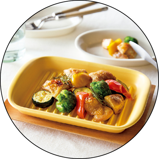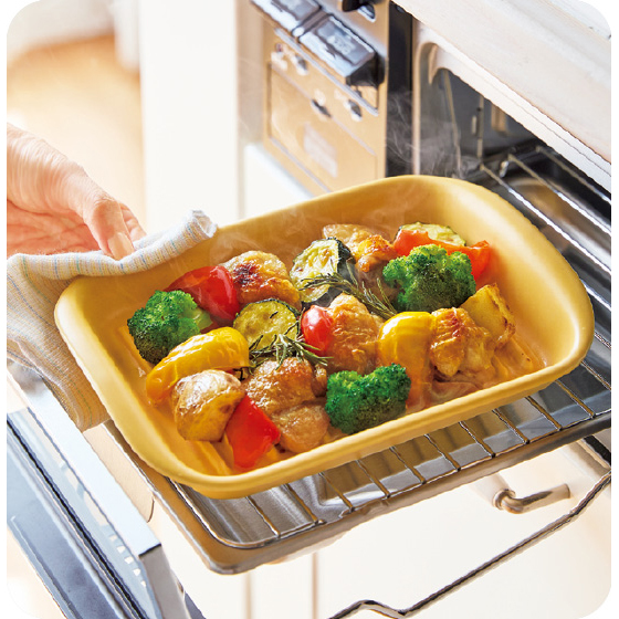 蓄熱性の高い陶磁器が食材にじんわり熱を加え、短時間で焼き上げます。溝に油が落ちてヘルシー。
