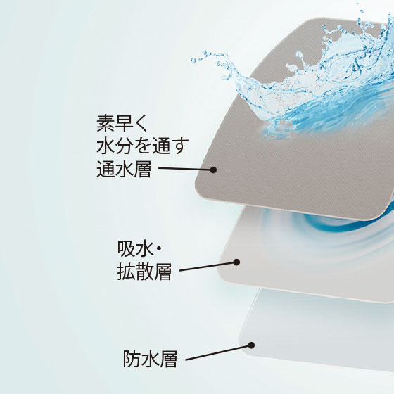 特殊な3層構造。繊維の老舗、ユニチカ(株)の技術により、約2mmという薄さながら驚きの吸水性を実現。