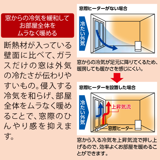設置工事不要!窓際に置くだけで、窓からの冷気を緩和。お部屋の温度ムラを軽減。結露を抑制。※窓枠に合ったヒーターを設置してください。