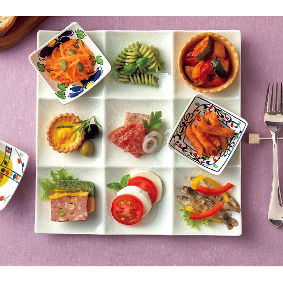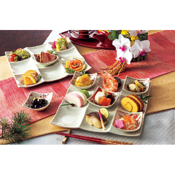 9つに仕切られているので、料理の味が混ざらず、盛りつけも簡単。豆鉢と組み合わせれば、お祝い事やおもてなしにふさわしい華やかな見栄えに。