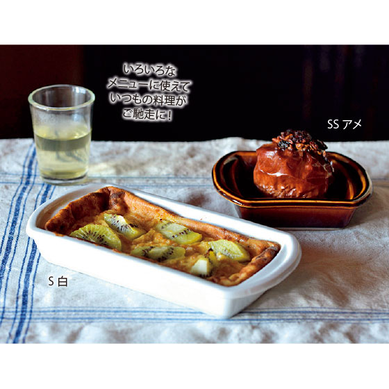 オーブンや電子レンジでの加熱調理が手軽にできます。ぽってりと厚みのある生地は蓄熱性が高く、食材の旨味を凝縮。持ちやすく運びやすい形状で、重ねられて収納もすっきり。
