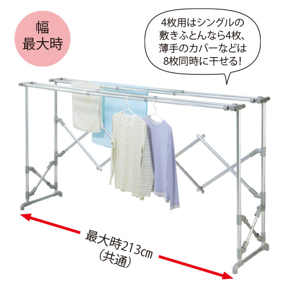 竿の2本使いにより干したふとんの内側に空間ができるから、裏面もしっかり干せます。薄手のものは竿を1本ずつ使ってさらにたくさん干すことも。