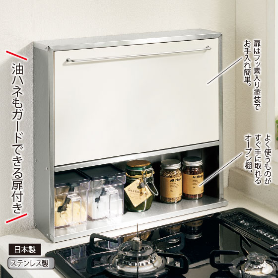 油ハネもガードできる扉付き。鍋などを置いたまま開閉できます。