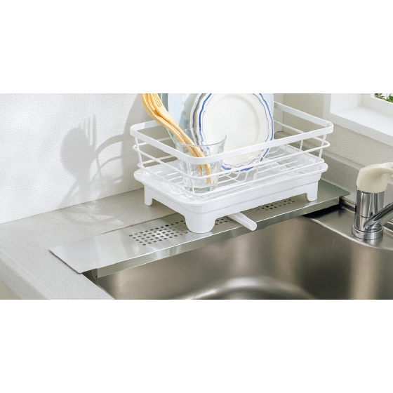 天板とフラットになるから使いやすい。シンクにぴったり設置できる伸縮式。ステンレスパンチング仕様で水切れ◎。
