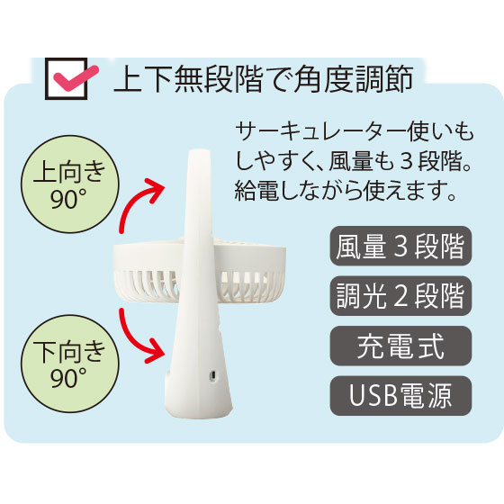 充電式で軽量、持ちやすいハンドル付きと、機動性もあり、あちこち持ち運べるファン。エアコンが効きにくいところや個室など、欲しいところに涼風を!調光可能なLEDライトはアウトドアや災害時の備えにも。