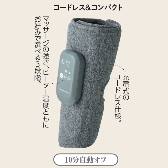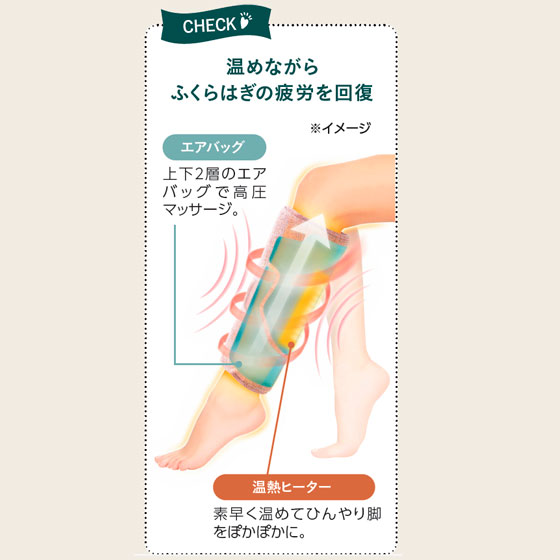 温めながらふくらはぎの疲労を回復。上下2層のエアバッグで高圧マッサージ。温熱ヒーターで素早く温めてひんやり脚をぽかぽかに。