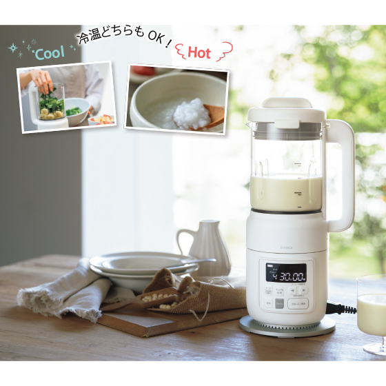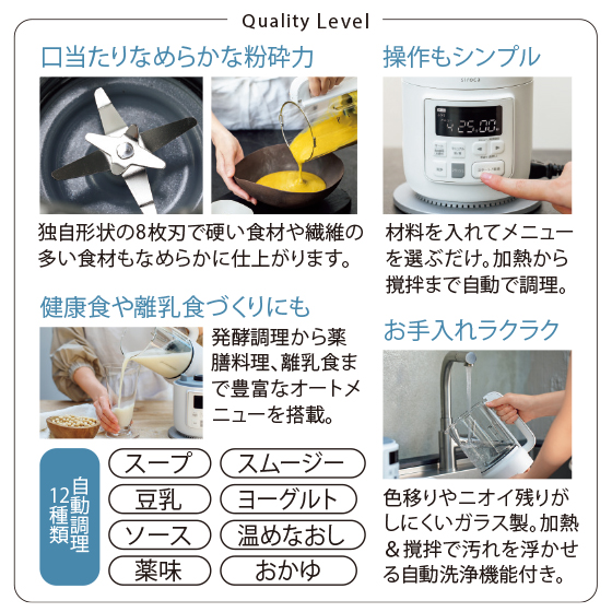 独自形状の8枚刃で硬い食材や繊維の多い食材もなめらかに仕上がります。材料を入れてメニューを選ぶだけ。加熱から撹拌まで自動で調理。