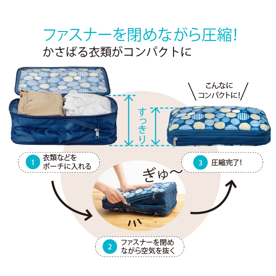 ※収納するアイテムによりサイズは若干前後します。ファスナー圧縮する際は手でしっかりと押さえてファスナーを閉めてください。
