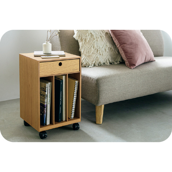 いつでもサッと取り出せる、木目の美しいマルチワゴン。