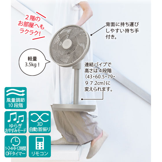 軽々と持ち上げられる、コードレスのDCファン。上下左右と幅広く首振りする「3Dモード」や、外気温を検知して風量を自動調節するモードなど、うれしい機能もたっぷり。