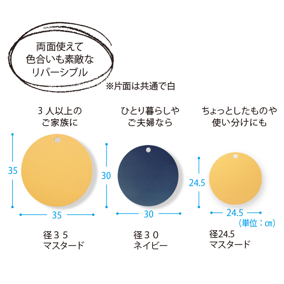 両面使えて色合いも素敵なリバーシブル(※片面は共通で白)。同じ直径で比べてみても丸型は使える面が広く、奥行きがあるので食材もこぼれ落ちにくい。