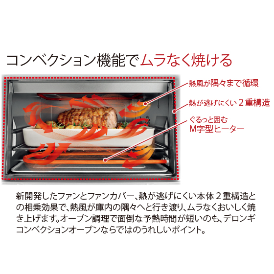 オーブンとは思えぬコンパクトな見た目ながら、デロンギの本格コンベクション機能を搭載。毎日の料理をおいしく、楽しくしてくれる1台です。コンベクションオーブンの特長は、庫内にファンを搭載し、熱風を循環させて加熱するコンベクション調理ができること。熱風で食材を包み込み、旨み成分を逃がすことなく、ムラなくおいしく焼き上げます。簡単操作で、トーストや冷凍ピザなどのふだんの料理も、おもてなしのごちそうもおまかせ。通常のオーブン調理やグリル調理、揚げないノンフライ調理などさまざまな調理ができて、料理の幅も広がります。