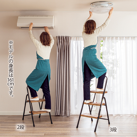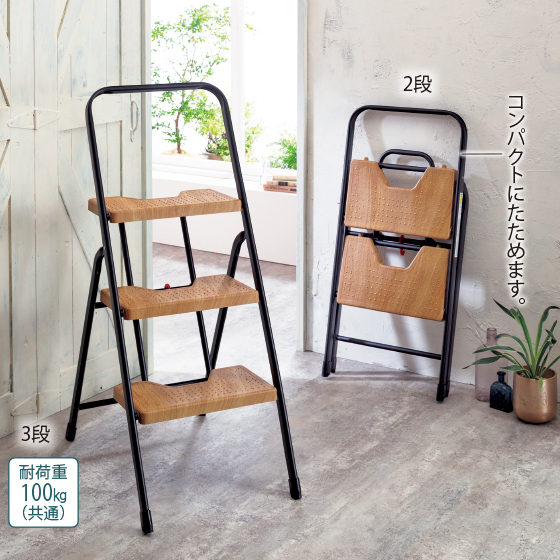 高所でも安定して作業がしやすい。マットなフレーム×木目調ステップ。置いたままでも絵になる才色兼備!