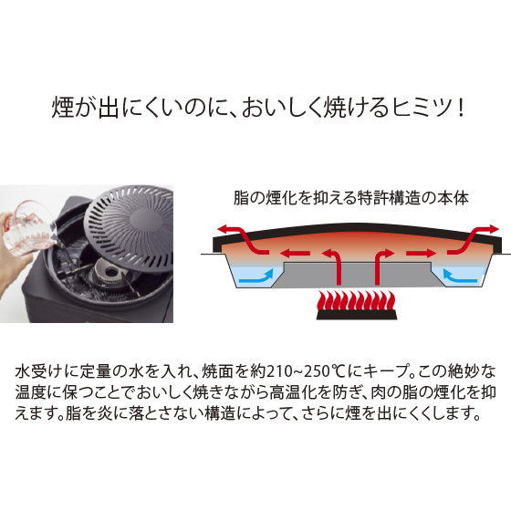 煙が少なく、上手に焼ける特許構造のグリル。直火ならではの加熱力でご家庭でも専門店のような美味しい焼肉が味わえます。上品なマットブラックとシンプルな形で使いやすい。