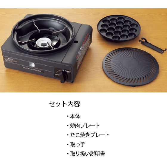 ●材質:本体=SPCC(粉体塗装)、焼肉プレート・たこ焼きプレート=ADC−12(フッ素加工)、五徳=耐熱ADC(黒ニッケルメッキ加工)、バーナー=耐熱ADC、点火つまみ=ABS樹脂