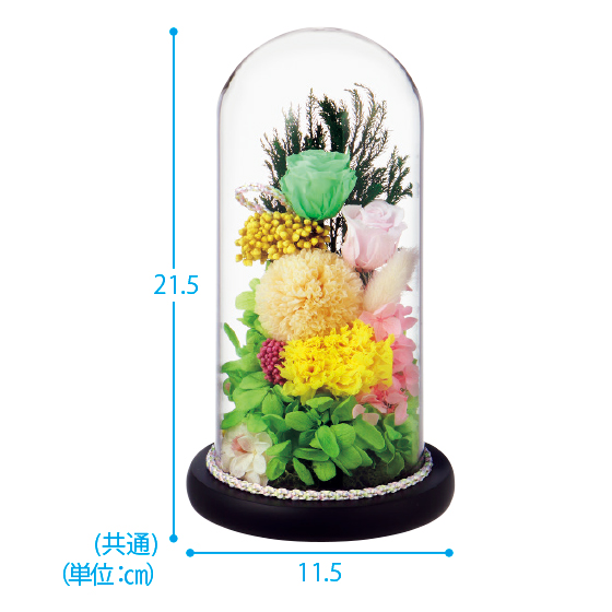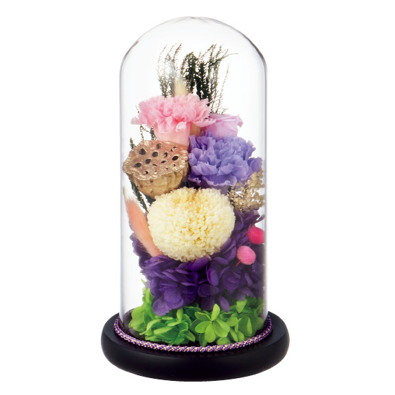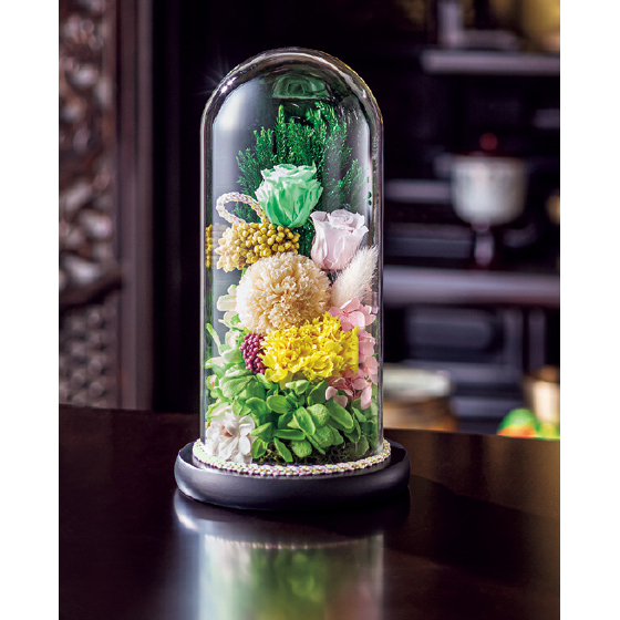 ガラスドームに包まれた、高級感漂うプリザーブドフラワー。水やり不要、埃や汚れは拭き取るだけ。長期間、供花を美しい状態で保てます。