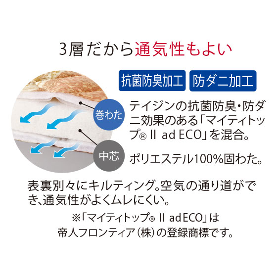 ●素材:側地=綿100%、詰めもの=巻わた/ポリエステル100%(中空糸1穴使用、抗菌防臭・防ダニ加工)、中芯/ポリエステル100%固わた(シングル=計5kg、ダブル=計7kg)
