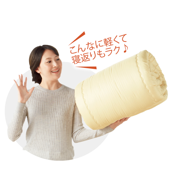 羽毛や羊毛など、一般的な掛けふとんは2〜3kgなのに対し本品は約1.5kgの軽さ。