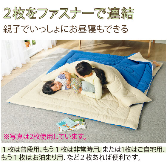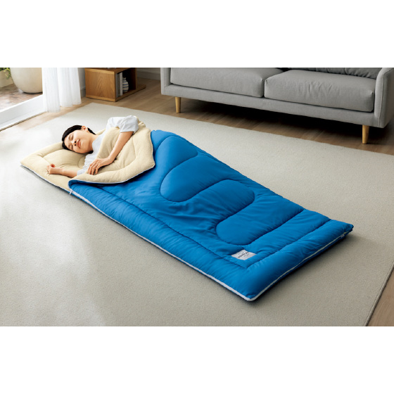 江戸時代に創業した老舗の繊維企業モリリン(株)が、寝具づくりで培ったノウハウを活かして作ったのがこちらの寝袋。誰でも使いやすい封筒型の形状で、普段使いもしやすいのがうれしいポイントです。肌面はやわらかな綿パイルで寝心地良好。収納も簡単で、来客時やいざという時にも役立ちます。