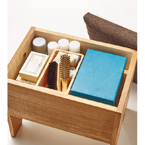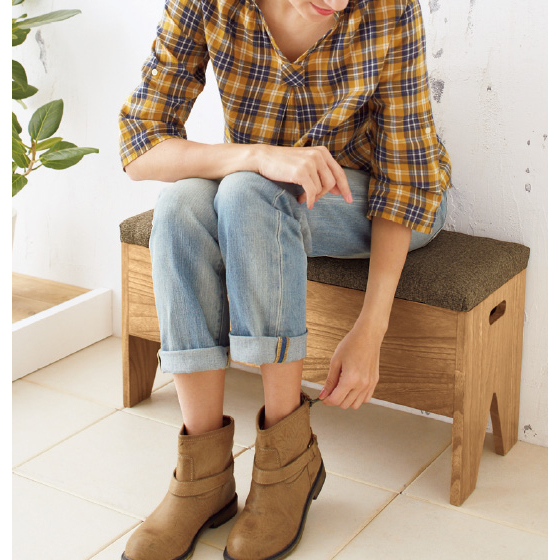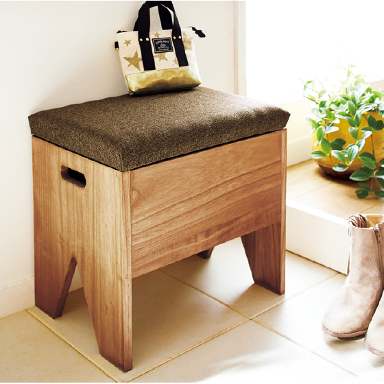 座って靴を脱ぎ履きしやすい高さです。座り心地のよい布張りクッション付き。素朴な味わいの桐材使用。