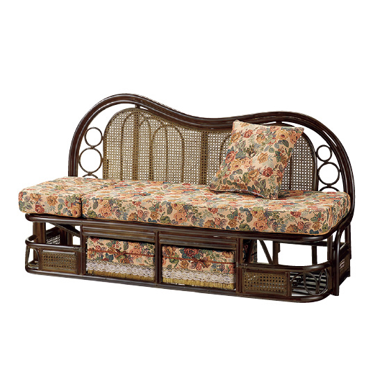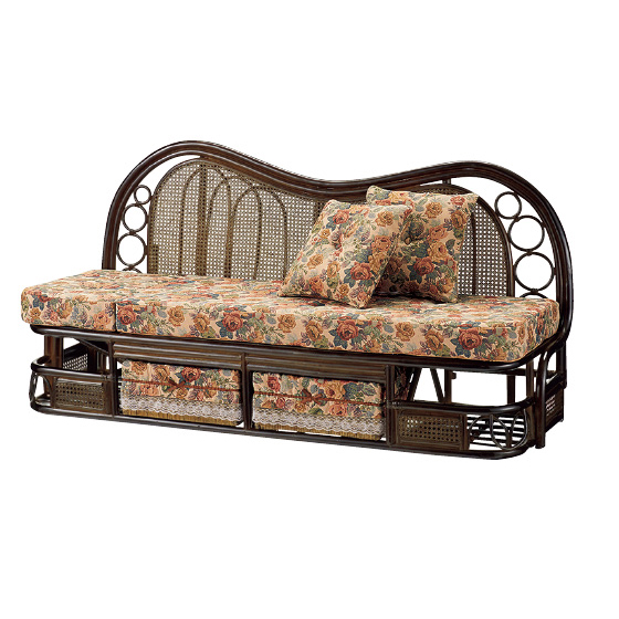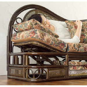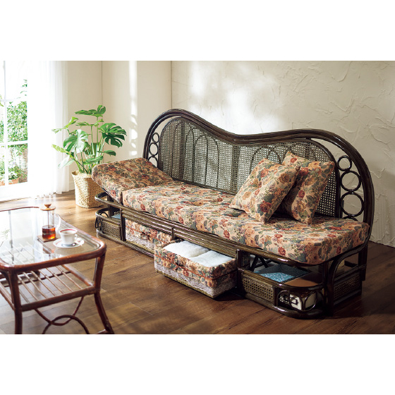 籐とジャカード織で優雅に。頭を上げられ、昼寝もラク。座面下には引き出しと収納ラック付き。