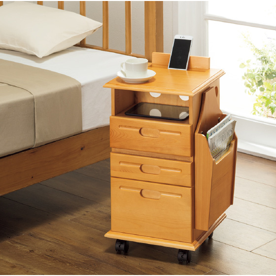 ベッドサイドに置くために購入。表側と裏側にフラップ扉の小物入れ、その他に引き出しが2つ、雑誌ラック?も付いて多様な収納が可能。ただ、小ぶりなので、入れようと思っていたジュエリーボックスが入らなかったのは残念。天然木が気に入り注文しましたが、ラッカー塗装の色が結構オレンジ色っぽかったのはがっかりです。