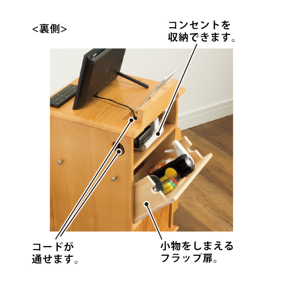 スマートフォンなどを立てて充電。どちら側にも掛けられるラック。上段はフラップ扉。キャスター付き。