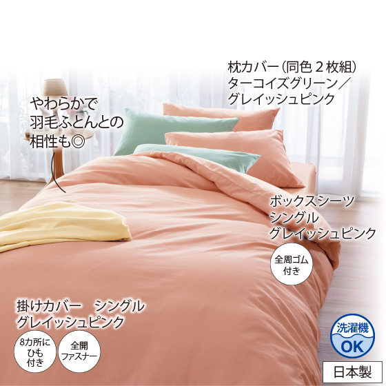 ※洗濯の可否・方法は各商品の洗濯表示をご確認ください。洗濯時にはネットをご使用ください。ご家庭の洗濯機に入らない場合がございますので、取扱説明書をご確認の上、難しい場合は手洗い、またはふとんが洗えるコインランドリーをおすすめいたします。※寝具商品は、生地幅の関係上ハギ(つぎ目)が入ることがございます。また裁断の都合により柄の出方が多少異なりますので、あらかじめご了承ください。