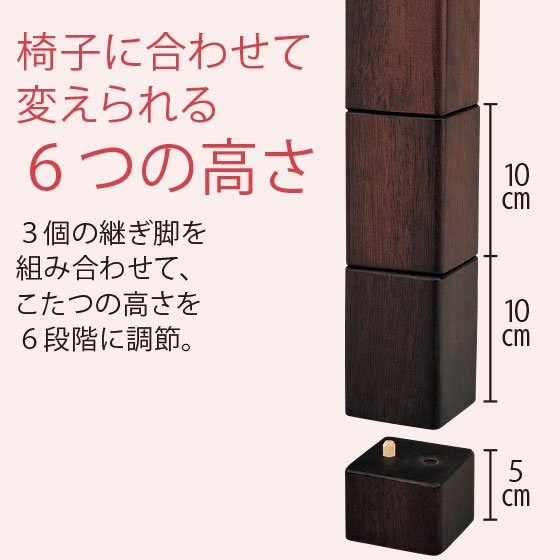 3個の継ぎ脚を組み合わせて、こたつの高さを6段階に調節。