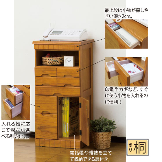 最上段は小物が探しやすい深さ2cmの引き出し。中段の引き出しは印鑑やカギなど、すぐに使う小物を入れるのに便利!下段は、入れる物に応じて深さが選べる引き出しと電話帳や雑誌を立てたまま入る扉付き収納も。