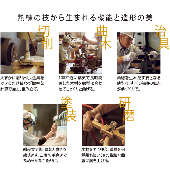 高い技術が曲木の継ぎのない一本木の強度と繊細な曲線をつくる。