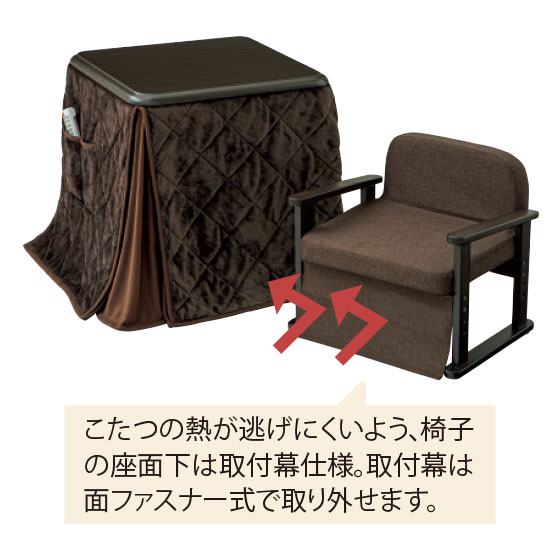 ●材質:天板=繊維板(ウレタン樹脂塗装)、脚部=天然木、<掛けふとん>側地=ポリエステル100%、中材=ポリエステル100%(正方形(58)=0.08kg、長方形(70)=0.09kg)、<椅子>背部=スチール、脚部=天然木(ラッカー塗装)、座部=合板、張地=ポリエステル、中材=ウレタンフォーム