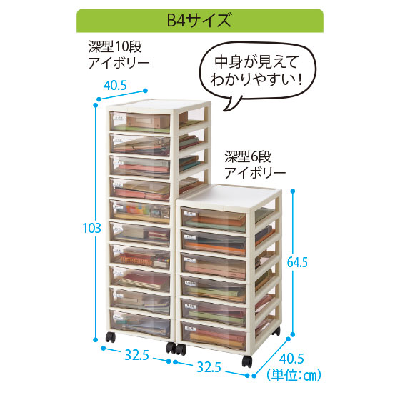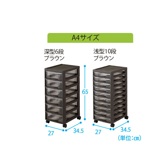 ●サイズ:A4サイズ=幅27×奥34.5×高65(深型6段)・64(浅型10段)cm、B4サイズ=幅32.5×奥40.5×高64.5(深型6段)・103(深型10段)cm