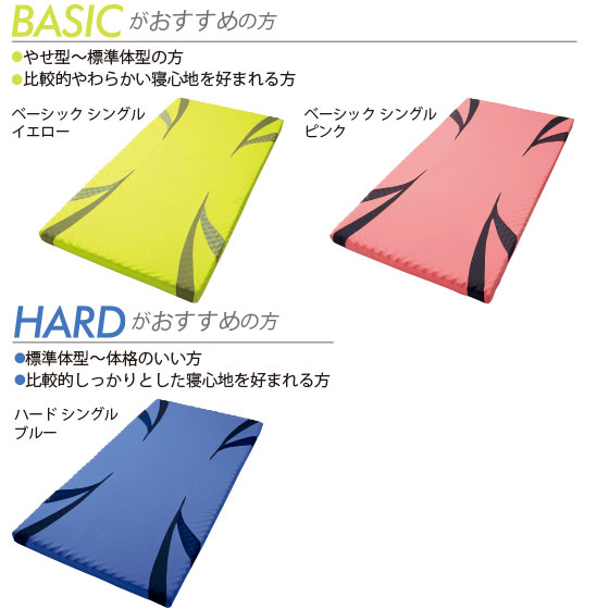 ●重量:ベーシック=シングル/4.7kg、セミダブル/6.4kg、ダブル/7.5kg、ハード=シングル/4.7kg、セミダブル/6.7kg、ダブル/7.9kg