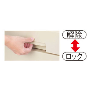 引き出しはサイドローラー内蔵でスムーズな引き出し感。落下防止機構付き。不意な飛び出しを防ぐオリジナルロック機構付き。持ち手部を軽く引き上げると解除されます。