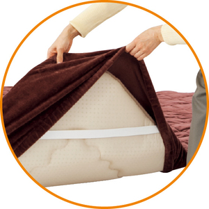4隅に丸みをもたせ、ズレ防止のゴムベルトも付けているのでふっくら敷きふとんにぴったりフィットします。表地は、ふかふかした感触のマイクロファイバー。