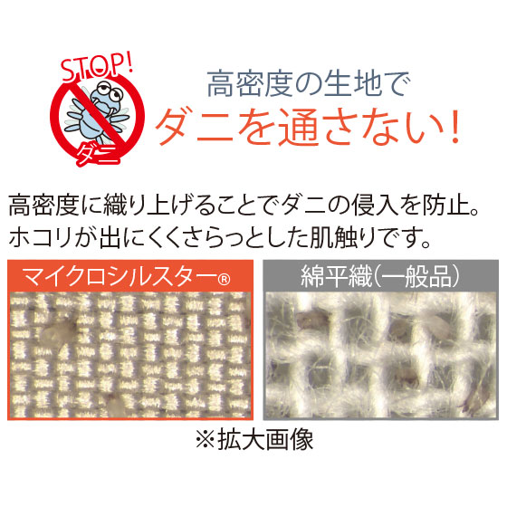 高密度に織り上げることでダニの侵入を防止。ホコリが出にくくさらっとした肌触りです。巻わたと中芯を交互に重ねた5層ミルフィーユ構造。