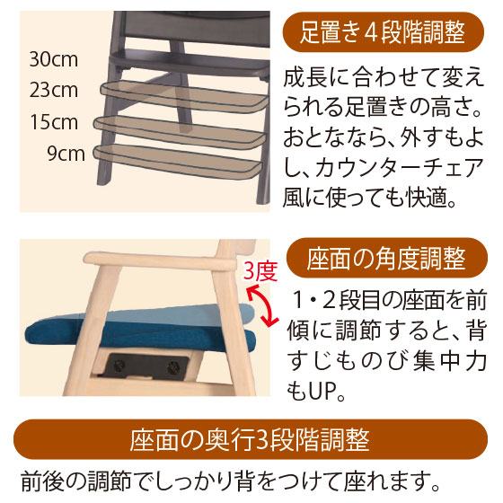 成長に合わせて変えられる足置きの高さ。大人なら、外すもよし、カウンターチェア風に使っても快適。1・2段目の座面を前傾に調節すると、背すじものび集中力もUP。