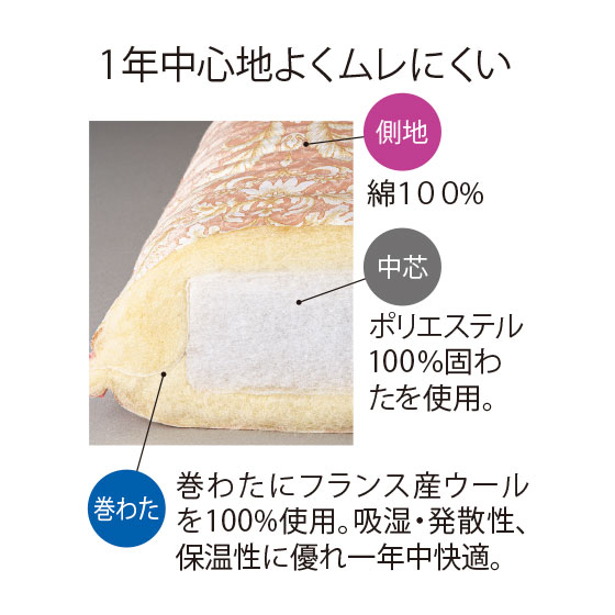 巻わたにフランス産ウールを100%使用。吸湿・発散性、保温性に優れ一年中快適。