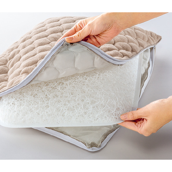 側地カバーはやわらかな綿パイルとさわやかなメッシュのリバーシブル。中わたに抗菌防臭・防ダニわたを使用。
